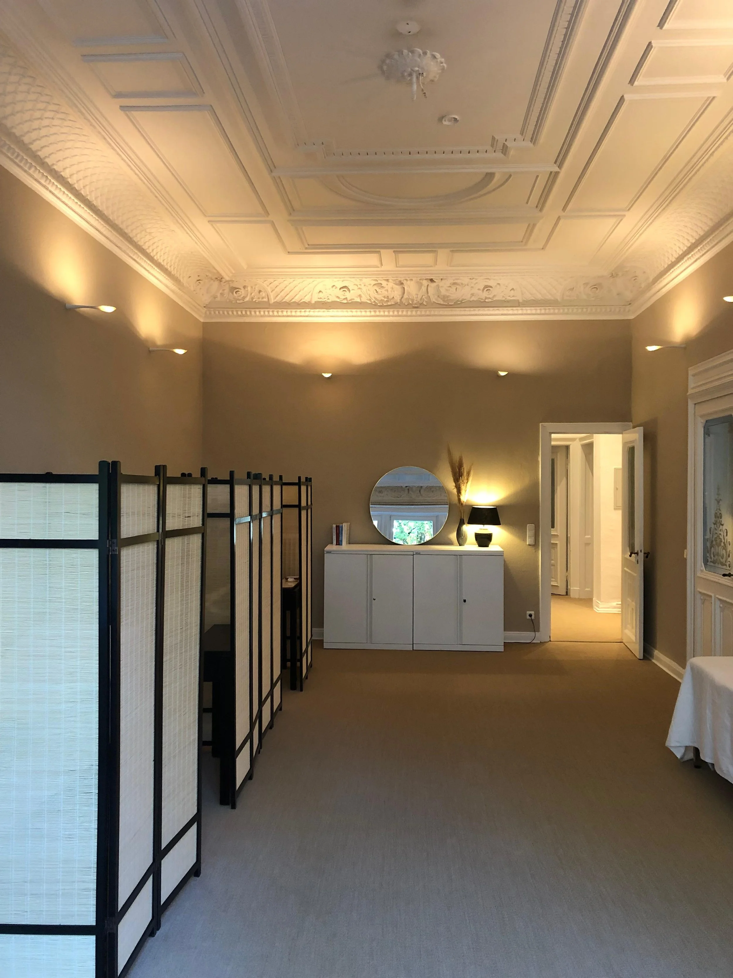 Deine Behandlung findet in einem großen Raum mit 3 Liegen statt. Die einzelnen Behandlungsplätze sind durch Trennwände voneinander separiert, sodass ein geschützter und ruhiger Rahmen entsteht.